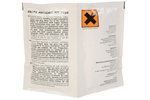 Use the KRUPS F054 Descaling Powder for kettles, coffee makers, espresso machines and when your KRUPS fully automatic espresso machine requires a descaling cycle. The KRUPS F054 Descaling Powder eliminates mineral build-up, to ensure an even-tasting coffee and to prolong the life of your machine. We recommend you to use the descaling powder at least every three months.2 packs of descaling powder